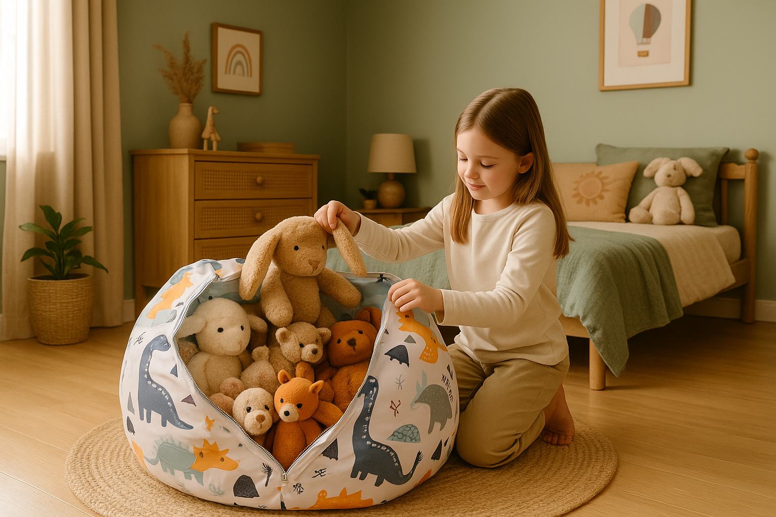 Les jouets et peluches sont rangés en quelques minutes, sans multiplier les coffres et bacs.